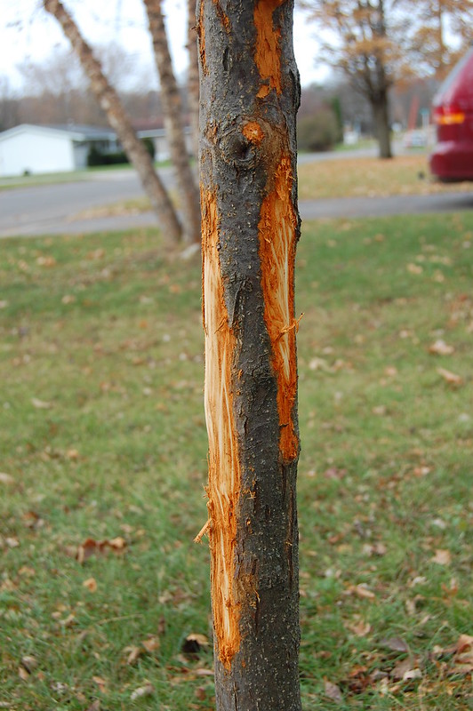 Bark rub on a young tree. Younger trees may have a harder time recovering from deer damage.
