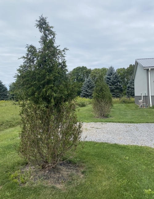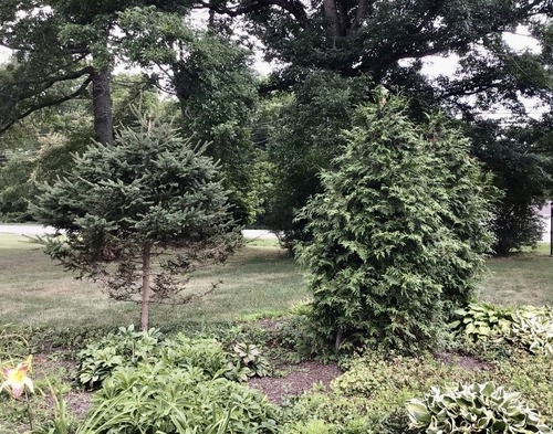 The spruce, left, has been hit hard by deer damage. The client has chosen to protect these newly planted arborvitae, right, with a foliar deer repellent to keep them full and healthy!